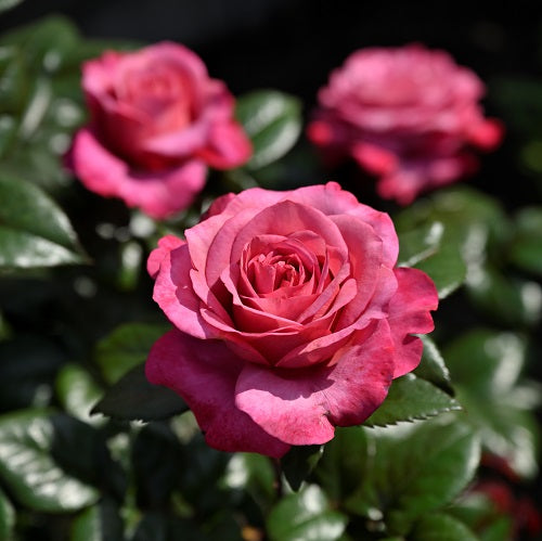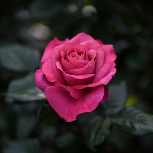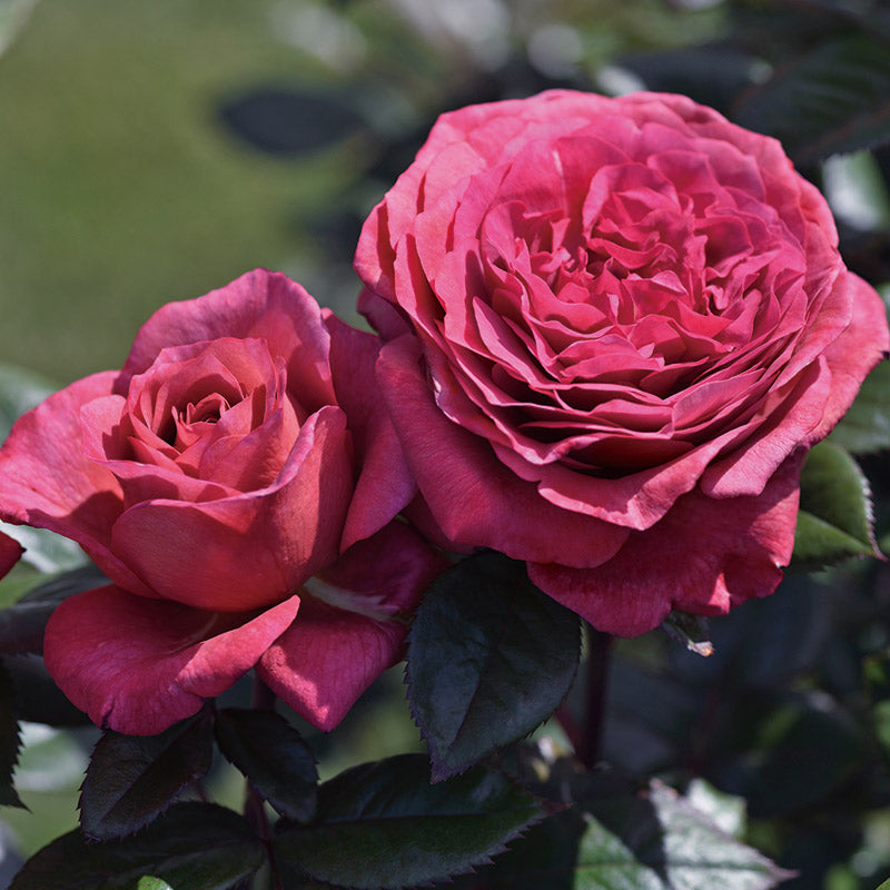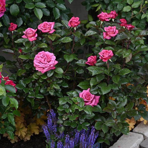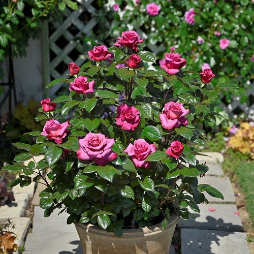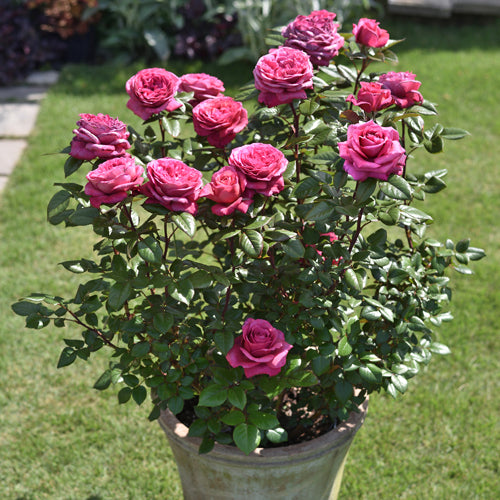 ニュアンスのあるシックな赤紫で高芯~ロゼット咲きの大輪、強香バラ。中型の木立性で、まとまりの良い樹形です。