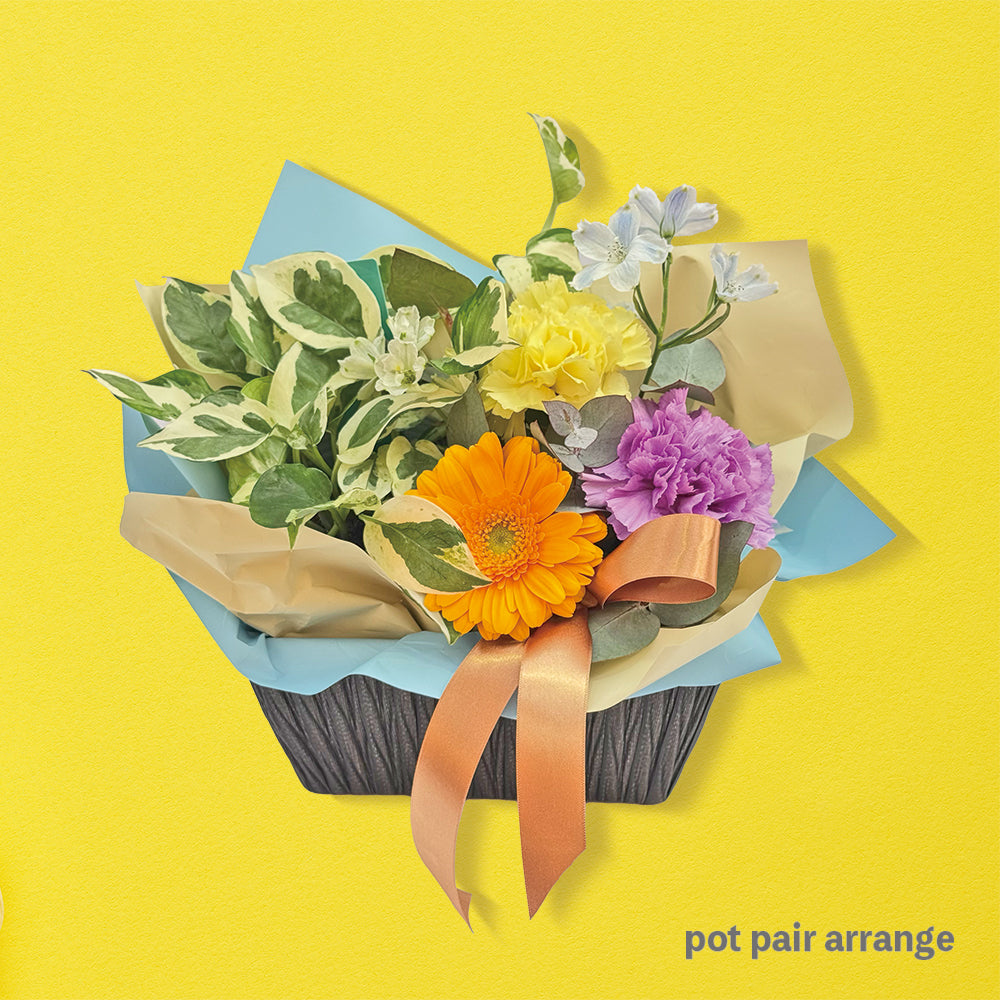 ポットペアアレンジとは寝付きの観葉植物と、生花アレンジが入った、生花が枯れてしまってもGreenを飾っておける素敵なアレンジとなっています。■サイズ