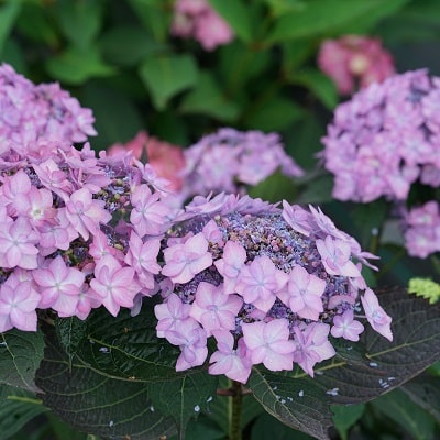 また、他のアジサイよりも繰り返し咲くタイミングが早く、秋まで待つことなく新しい花を楽しめます。花の咲き方は、ガクアジサイの形(レースキャップと呼ばれます)ですが、両性花の花びらがとても大きく、装飾花を覆うようにたくさん咲きます。