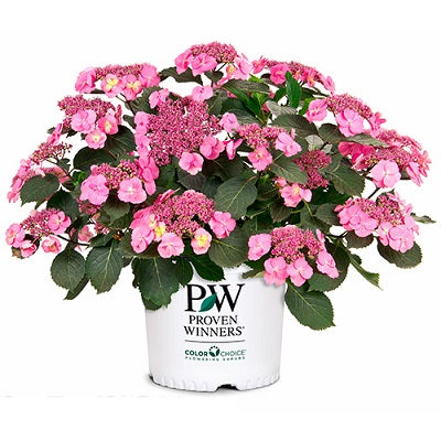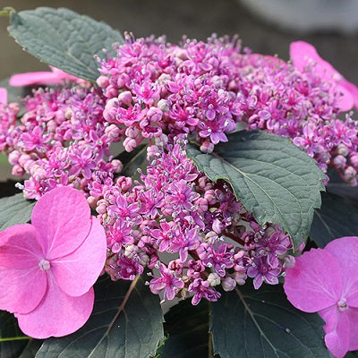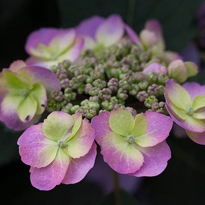 半八重咲きから八重咲きの丸みのある小花が華やかな印象で、中央がクリーム色やピンク色の花が咲き、やがて全体が濃いピンク色へと変化します。土壌のpH(土壌酸度)によっては、紫系の花が咲きます。つぼみや茎の耐寒性が強く、丈夫で育てやすい品種です。