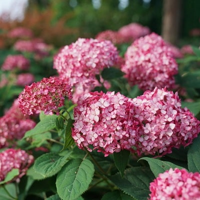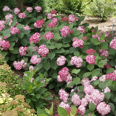 アメリカあじさいの中で最も濃い赤色の花が咲く品種です。つぼみは濃い赤紫色で、明るい赤とシルバーピンクのバイカラーの花が咲きます。葉の色は濃く深い緑色で、葉色と花色のコントラストが魅力です。花色は咲き進むと、グリーンへと変化します。
