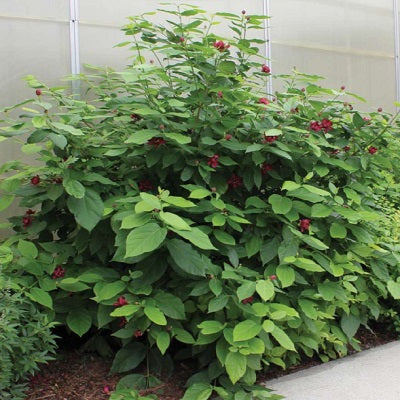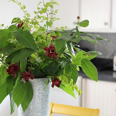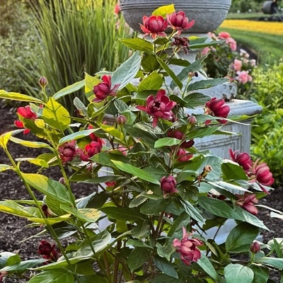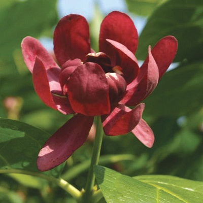 夏に鮮やかなワインレッド色の花を咲かせるクロバナロウバイです。ベルベットのような厚みのある花びらと、光沢のある美しい葉が魅力的です。最初の花が終わった後も次々と花を咲かせるため、長い間楽しむことができます。すべての花が咲き終わったら、翌年の花芽がつく前に剪定しましょう。