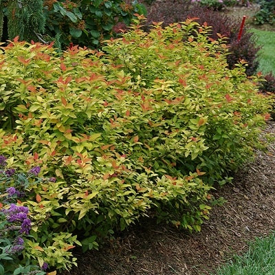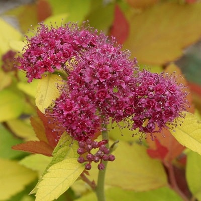 春から秋まで葉色が変わり季節の移ろいを感じさせてくれるシュラブ(低木)です。綿毛のようなふわふわの花も魅力で、栽培も非常に簡単なシモツケです。日なたでも半日陰でも育てられる丈夫な庭木のため、ガーデニング初心者の方にもおすすめです。花房は、3~7cmになります。