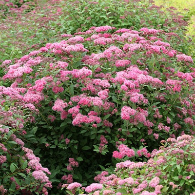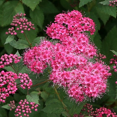 丸みを帯びた樹形と春の新芽の深い銅葉、そして鮮やかな明るいピンク花のコンビネーションが華やかなシモツケです。非常に丈夫なため、栽培は簡単で初心者にもおすすめの庭木です。
