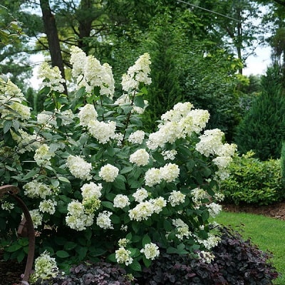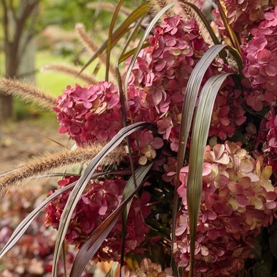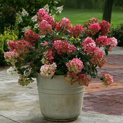 大きな円錐形の花序が株いっぱいにつく、存在感抜群のノリウツギです。花色がホワイト色から晩夏には鮮やかなピンク色へ、さらに秋にはザクロのような深みのある鮮やかな赤色に変化し、長い間庭を美しく彩ります。