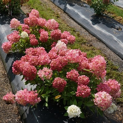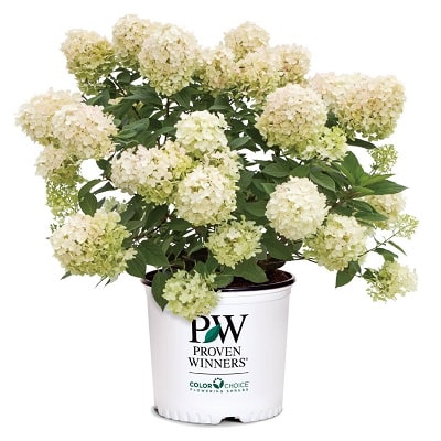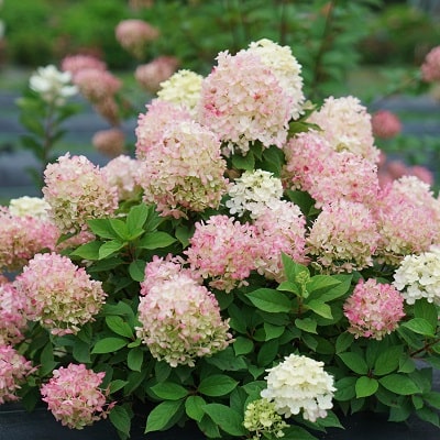 もっとも小さいノリウツギの1つです。緑の葉を覆い覆いつくすように円錐状の花穂をたくさんつけます。夏に咲くライムグリーンの花は、秋になると徐々に淡いピンク色を帯びやがて濃いピンク色へ、花色変化を楽しめます。