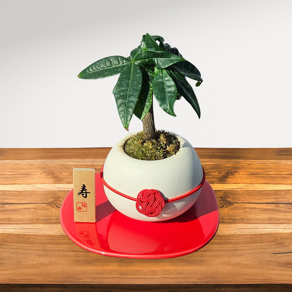 福を呼ぶ木(パキラ)とお餅のような器を合わせた縁起もの。