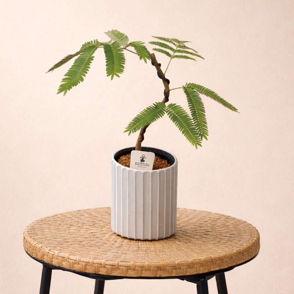 細かい羽状の葉がやさしく広がる姿が魅力の観葉植物を、盆栽風に仕立てたインテリアグリーン。